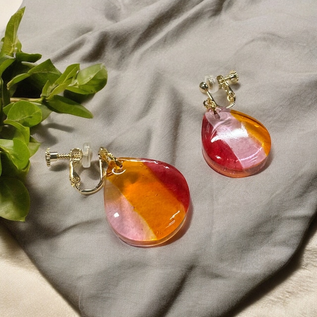 ご覧いただきありがとうございます。 三色のレジンを縦に切り、組み合わせたチャームを耳飾りに仕立ててみました。 ちょっと飴玉みたいな色艶です。 金具を除いた全長 2.5cm 幅 約2.0cm どんな服でも全体をポップに引き締めてくれます。 季節は問いません。 寒色系も作ってみるつもりです。